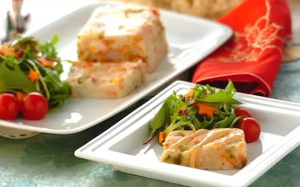 クリスマスに豪華な前菜を作りたいのならコレ! エビやスモークサーモン、ホタテを使ったテリーヌです。クリスマスらしい彩りで、テンションが上がります。お好みの野菜を飾って、より映える一皿に仕上げるのもいいでしょう。テリーヌ型がない場合は、耐熱容器やパウンドケーキ型で代用できます。