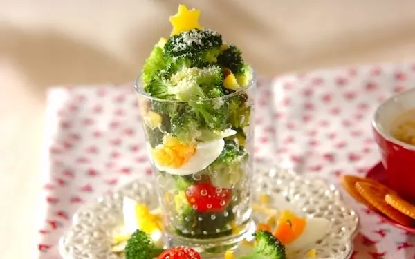 ブロッコリーにデコレーションして、クリスマスツリーのように仕立てたサラダ。ガラスのコップに順番に具材を入れ、台皿にマヨネーズで線を描き、ガラスコップに入らなかった野菜やゆで卵を飾れば完成です。お好みで、ピスタチオ、粉チーズを散らしましょう。子どもと一緒に作るのも楽しそうですね。
