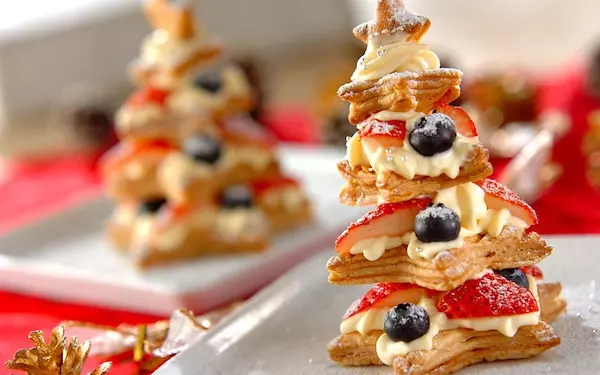 クリスマスディナーのデザートに、ツリーの形をしたミルフィーユはいかがでしょうか。食卓が盛り上がること、間違いありません。家族みんなでデコレーションするのも良いですね。一番小さい星型のパイはトップに立てて置き、仕上げに、粉砂糖を振り、アラザンを散らしましょう。