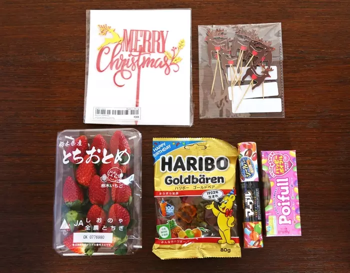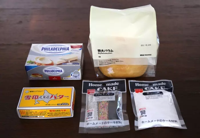 用意するものは、「特大バウム」と中に詰めるお菓子と外側に塗るクリームだけ。お菓子はチョコやグミやポップコーン、マシュマロ、フルーツなどお好みのものを。また、絞り袋でクリームを絞る自信がなかった筆者は「ケーキトッパー」を準備しました。3COINSの他、ダイソーやセリアなどの百円ショップでも、可愛くてお手頃なものがいろいろあります。手軽に買えるAmazonや楽天ショップにも。