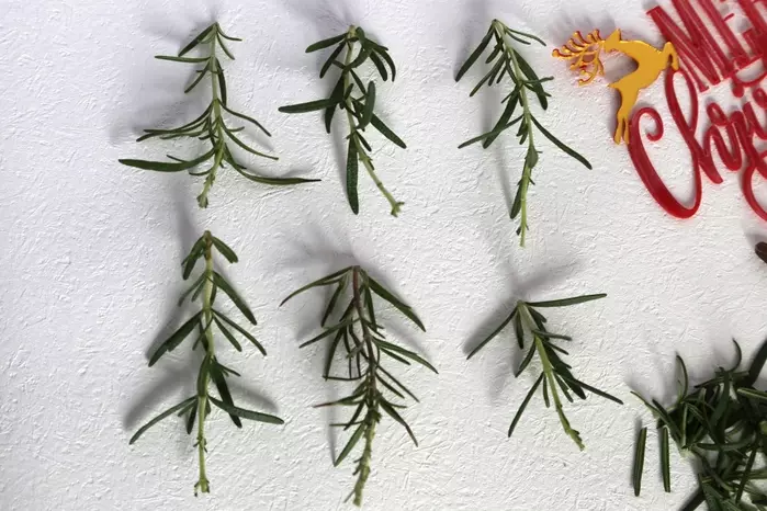 また、今回ローズマリーの葉でクリスマスツリーを作ってみました。逆さまにして下の部分の葉をとったらあら不思議。粉砂糖を降れば雪の中のモミの木に♪