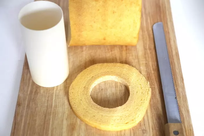 お菓子を詰めた後の穴にフタをするため、1センチほどカットして穴埋め用に取っておきます。ポップコーンがあれば上の方まで埋まるので、切らずにそのまま詰めてもいいかもしれません。