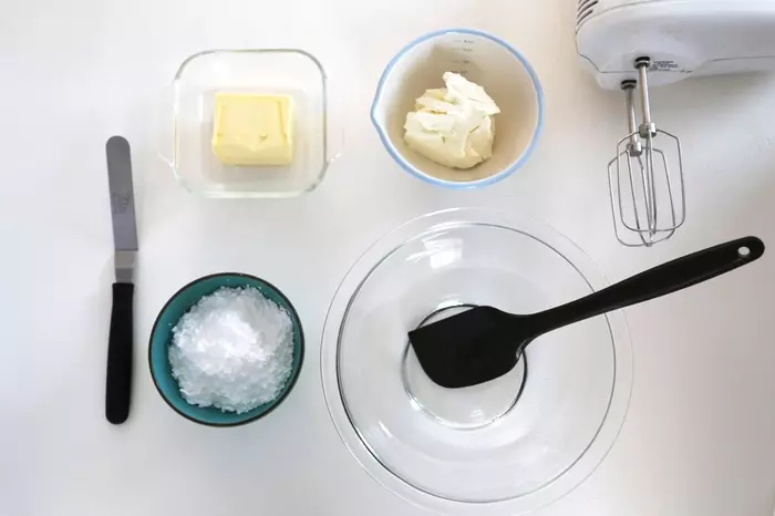 さて、今回の「クリームチーズクリーム」は、クリームチーズ200g、無塩バター100g(有塩でもOK)と粉糖を100g用意しました。クリームチーズとバターを常温に戻してやわらかくしておきます。