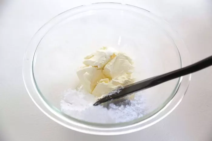粉糖とクリームチーズをヘラで練り馴染ませます。