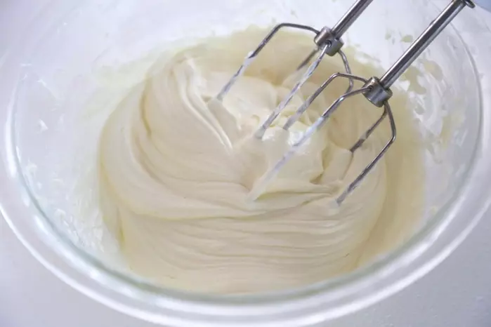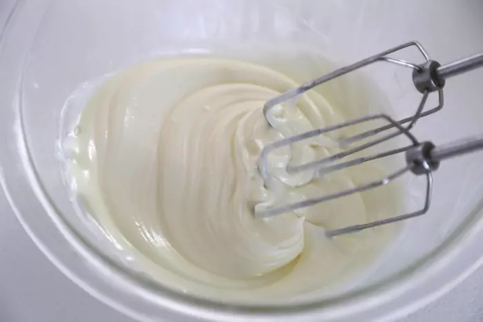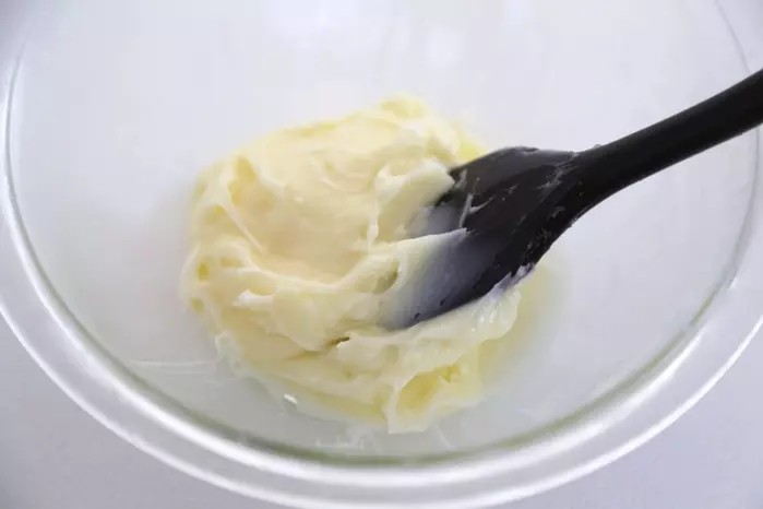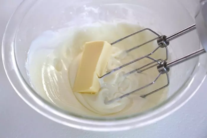 バターを加えて、空気を含ませるように白くふんわりするまで泡立てれば出来上がり。