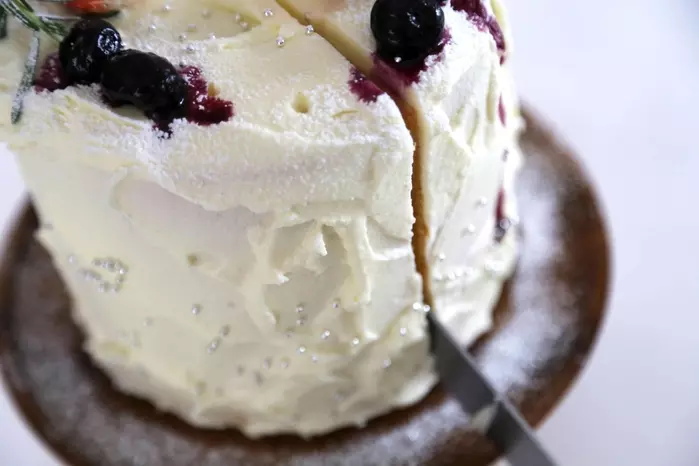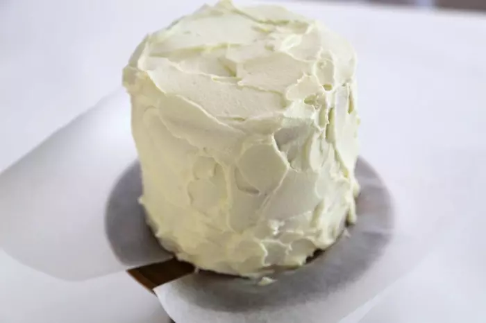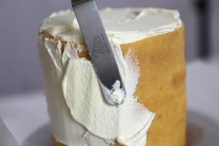 側面に沿ってクリームを塗ります。パレットナイフでペタペタとなでて模様をつけていくとテキトーでもナチュラルで良い感じに。