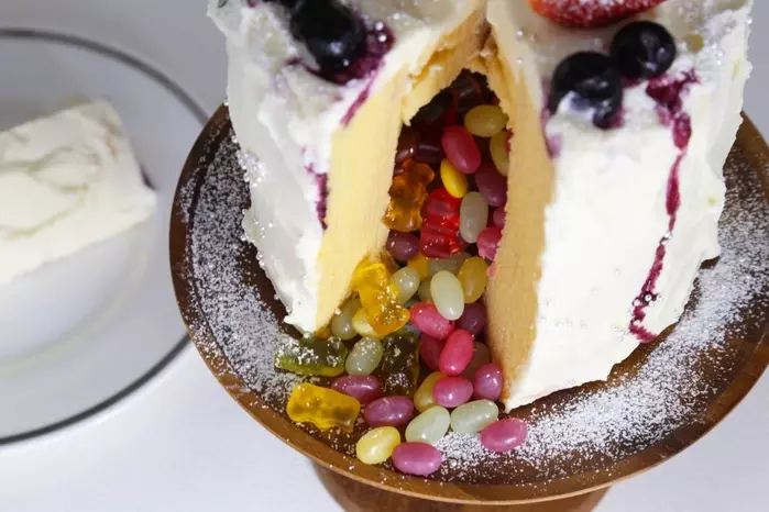 「くす玉」のようにケーキの中にお菓子や果物が入っていて、切ると溢れ出てくる仕掛けのあるケーキのこと。サプライズケーキ、かくれんぼケーキ、ギミックケーキなどとも呼ばれています。