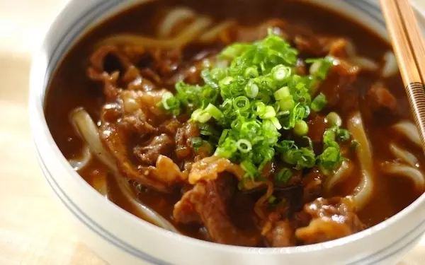 片栗粉をあらかじめ牛肉にまぶしておくのがコツ。そうすることで、柔らかな仕上がりに。カレールウと麺つゆで作るカレーうどんは、一度味わうとくせになります。包丁を使わず作れるのもうれしいポイントです。夜食にもピッタリ!