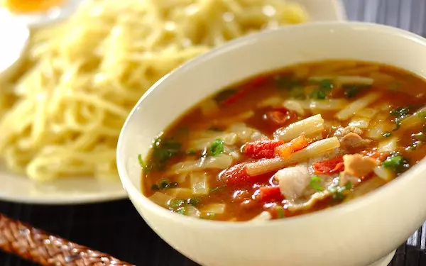 食欲がない日でも、サラッと食べられるのがこちらのつけ麺です。トマトの酸味が効いた和風のカレースープで、爽やかな味。麺にゆで卵を添えるとボリュームアップを図れます。夜食としても活躍してくれそうです。
