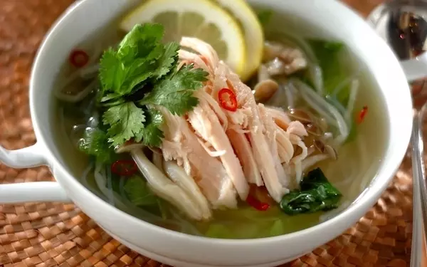 市販のサラダチキンを使った簡単レシピ。サラダ感覚で食べられる冷たいスープです。緑豆春雨入りでダイエット中の料理としてもGOOD。作り方は、ボウルにスープの材料を入れて顆粒チキンスープの素が溶けるまでよく混ぜます。そして、緑黄春雨、モヤシ、シメジ、レタスを加えて混ぜ、器によそってからサラダチキンをのせ、お好みでパクチーとレモンをのせれば出来上がりです。