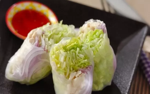 コンビニやスーパーで簡単に手に入るサラダチキンを使った生春巻きです。紫玉ネギ、レタスと一緒にライスペーパーで巻いていただきましょう。スイートチリソースをつけて、一口頬張ると、サラダチキンの旨味と野菜のさっぱり感がフワッと広がり、リピートしたくなる味わいです。紫玉ネギは普通の玉ネギに代えても大丈夫。