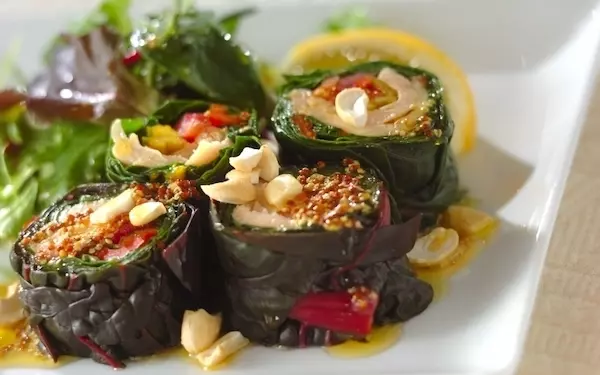 ビーツの仲間の野菜「スイスチャード」を使ってカラフルなロールサラダに。スイスチャードは、ホウレン草よりもアクやクセが少なく、生で食べられるのが特徴です。ドレッシングは、さっぱりとした味で糖質控えめ。最後に散らすカシューナッツが味を引き締めます。スイスチャード×サラダチキンという新感覚のロールサラダをご堪能あれ!