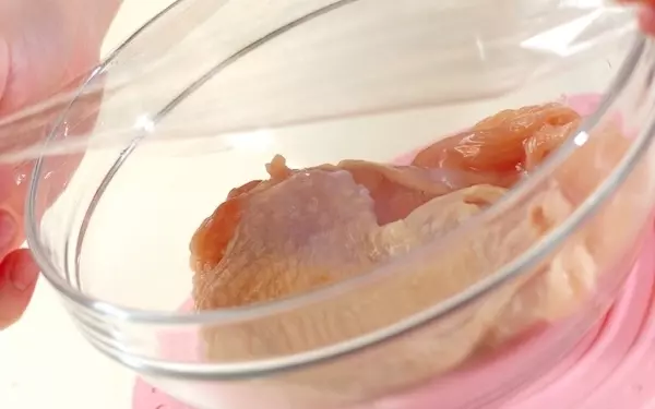 1、電子レンジ対応容器に下味をつけた鶏むね肉を入れ、ふんわりラップをし、電子レンジで約4分加熱する。
