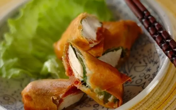 コンビニやスーパーで簡単に手に入るサラダチキンを使った生春巻きです。紫玉ネギ、レタスと一緒にライスペーパーで巻いていただきましょう。スイートチリソースをつけて、一口頬張ると、サラダチキンの旨味と野菜のさっぱり感がフワッと広がり、リピートしたくなる味わいです。紫玉ネギは普通の玉ネギに代えても大丈夫。