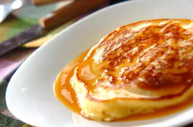 生地に豆腐を入れるので、ふわふわとしたパンケーキに仕上がります。キャラメルソースでいつものパンケーキをカフェ風の味わいに。キャラメルソースをたっぷり甘々にして、珈琲や紅茶と合せましょう♪