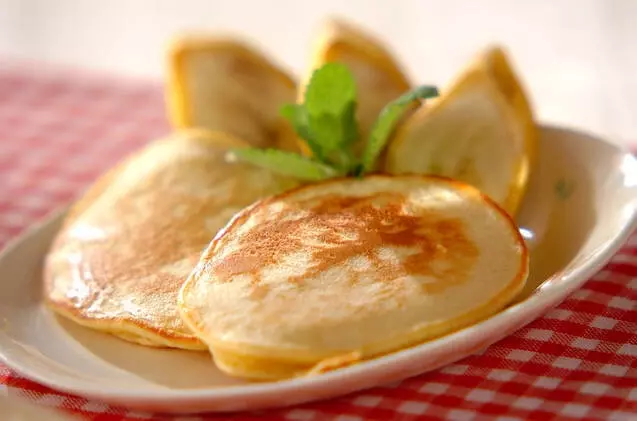 ふんわり焼き上げた生地にお好みのクリームやフルーツをサンドしてちょっと贅沢なおやつに。フライパンによってはつきやすいものもありますので、その場合は薄くバターまたはサラダ油をひいて下さいね。