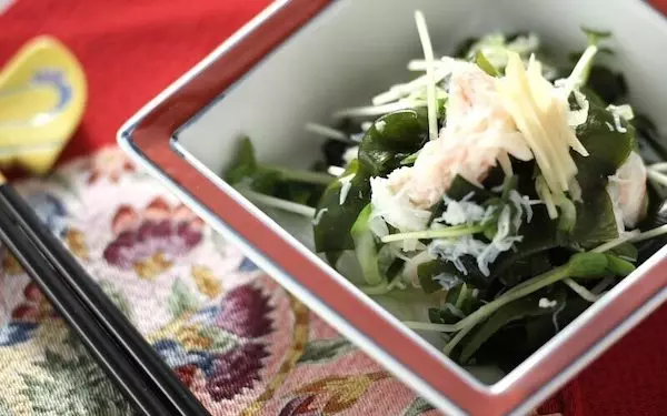 カニを甘酢とショウガでさっぱりと食べられます。ボウルに合わせ酢の材料を入れ、ワカメ、キュウリ、貝われ菜、カニ足を混ぜ合わせるだけのお手軽レシピです。最後に、針ショウガをのせてくださいね。お酒のおつまみにもピッタリです。