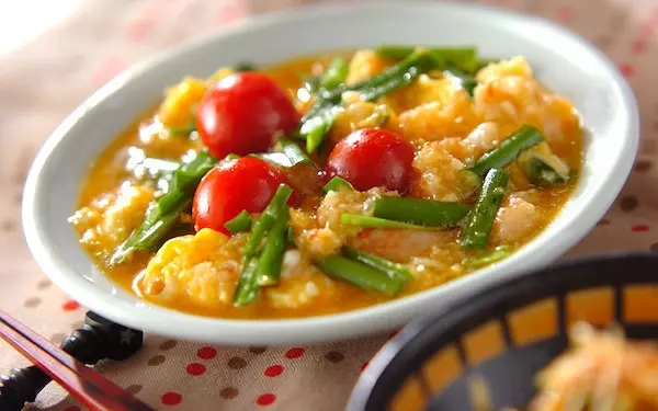 カニ缶を汁ごと入れたカニ玉です。カニの旨味と卵のまろやかさが混ざり合った絶妙な味の虜になりますよ。ミニトマトの酸味も程よい刺激に。卵は半熟状に仕上げげるとGOOD。ご飯がどんどん進む魅惑のレシピです。