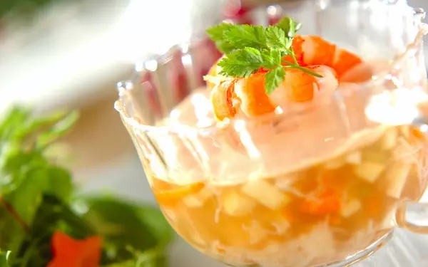 型抜きは不要。直接グラスなどに流し込むだけで出来上がるゼリー寄せです。ワイングラスなど背の高いガラスの器に盛るだけでグレードアップを図れますよ。パーティーの前菜としても良さそうですね。