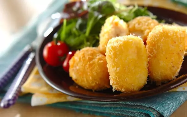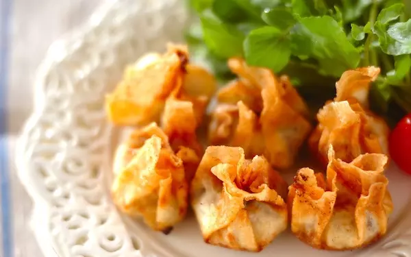 カリッと揚げた一口サイズのきんちゃくの中身は、なんとカニクリーム! レンジを使えば、ホワイトソースも手軽に作れます。カニのほぐし味を使ったプチ贅沢な一品です。パーティーシーンでも活躍の予感。