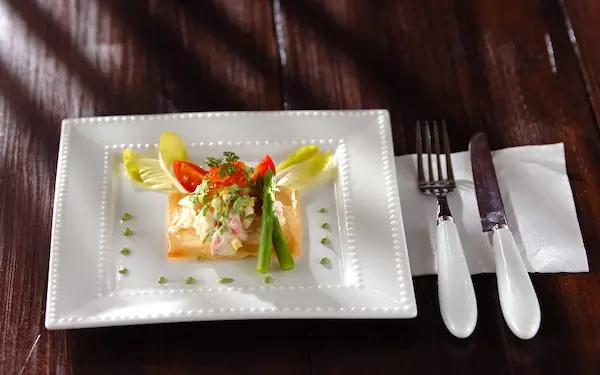 おうちビストロを実現できる華やかな一皿がこちら。地中海地方の名物「パートフィロー」のうえに、カニとユリネのパナシェを盛り、ゆで卵のみじん切りをのせます。アスパラマヨネーズを絞り、イクラ、セルフィーユを飾った後、周りにチコリ、プチトマト、ミニアスパラガスでお皿を彩ると、コース料理のような一品に。