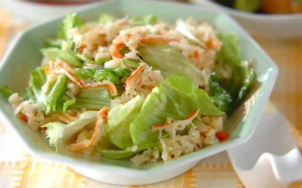 カニを茹でほぐした身を使った贅沢なチャーハン。たっぷりのカニから旨味があふれ出します。シャキシャキ食感を残すために、レタスは軽く炒める程度でOK。ショウガの風味がアクセントとなり、チャーハン全体を引き締めます。何度も味わいたくなりそうですね。