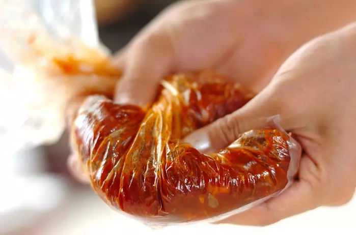 ・牛薄切り肉は食べやすい長さに切り、抗菌の袋に入れ、<調味料>の材料を入れてよくもみ込む。