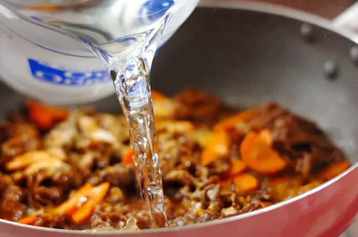 1、中華鍋、または鍋にサラダ油を熱し、牛薄切り肉を炒め、色が変わったらニンジンを加えて炒める。全体に火が通ったら<スープ>の材料を加える。