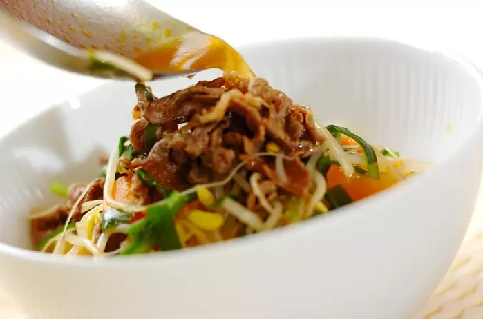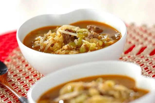 焼き肉のたれにコチュジャンを混ぜて味付けしたカルビを炒めて作る本格的なユッケジャンスープです。調理時間10分とスピーディーに作れます。ご飯だけでなくうどんや春雨も合いますよ。栄養価の高い豆もやしをたくさん入れて風邪に負けない体を作りましょう!体が温まりスタミナが付くスープです。