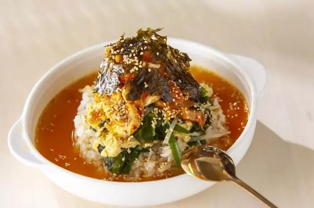 卵入りのやさしい味やコチュジャンを効かせたピリ辛味、牛骨を煮込んだコラーゲンたっぷりのスープにご飯を入れて…体が芯から温まります。