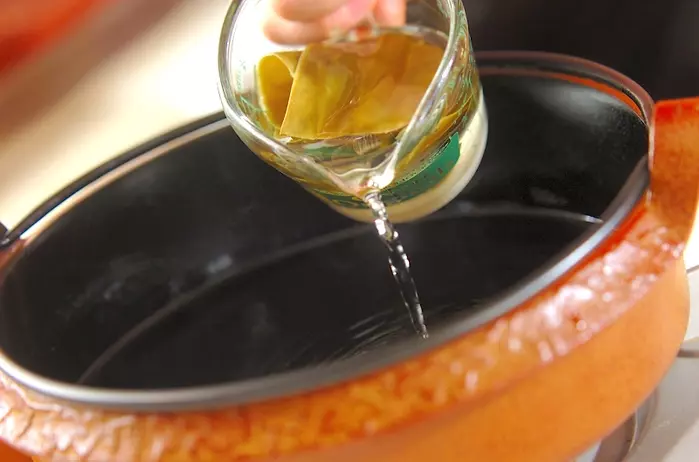 1、分量の水に昆布を入れて30分以上置く。鍋にみりん、しょうゆ、砂糖を入れて中火にかけ、2分ほど煮たたせ、昆布と水を加える。