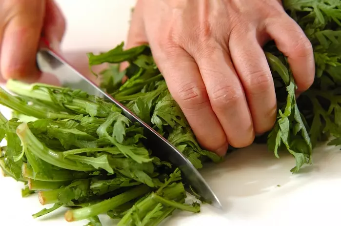 ・菊菜は根元からちぎり、長さを揃えておく。