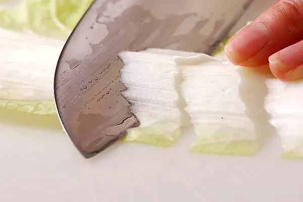 たれが染み込んでトロトロになった白菜はたまらないおいしさですね。白菜の芯は斜めに削ぐように切り落とし、断面を大きく取ると味が染み込みやすくなります。