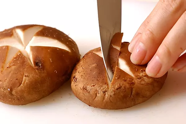 「十字切り」は傘の真ん中に斜めに包丁を入れ、十字に2本切り込みを入れます。「花切り」は3本切込みを入れて作ります。少し大きめに斜めに包丁を入れると見栄えの良い飾り切りができ、味の染み込みが良くなります。