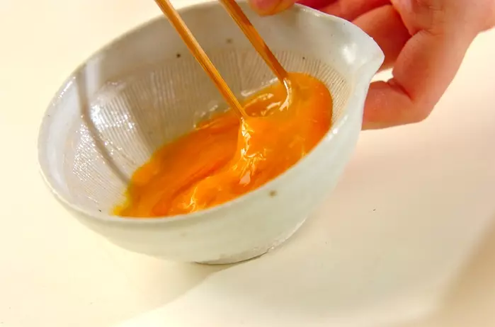 3、器に卵を割って溶きほぐす。鍋にアクが出れば取り除き、溶き卵につけていただく。