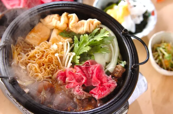 3、他の具を加え、お好みで味をみながら<調味料>を加え、煮えた物から順に溶き卵をつけていただく。最後に水で少し煮汁を薄めて、うどん玉を加え煮込んで取り分ける。■定番のすき焼き具材7選