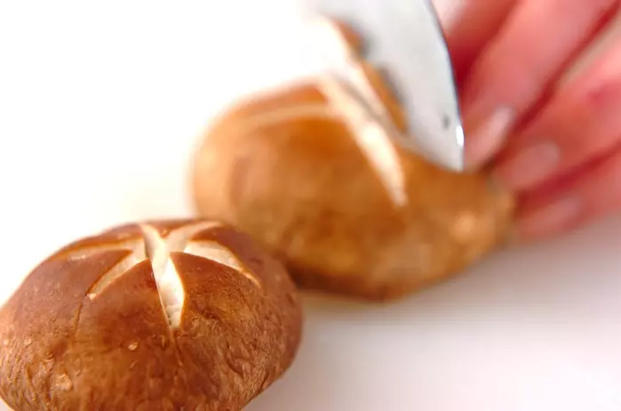 ・シイタケは石づきを落とし、かたく絞ったぬれ布巾で汚れを拭き取り、笠に飾り切りをする(大きい場合は半分に削ぎ切りにする)。
