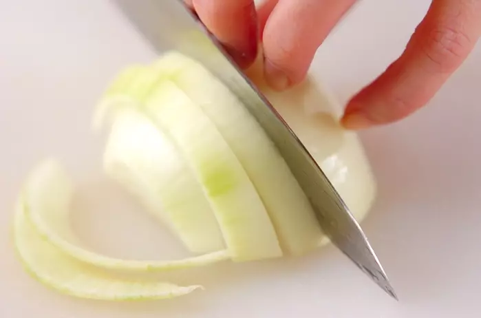 ・玉ネギは皮をむいて縦半分に切り、さらに横1cm幅に切る。