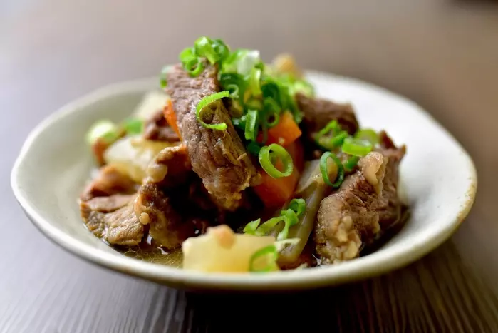 火が通りにくいジャガイモは、半月切りにしてレンジでチンしてから入れるとホクホクに。甘辛ダレで煮込んだジャガイモは、肉じゃがに似た甘辛味ですが牛肉ならではの別格の味わいです。