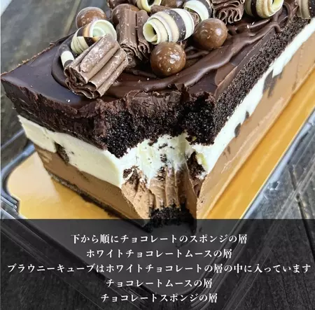 下から順にチョコレートのスポンジ、クリームチーズ、ブラウニーキューブ入りのホワイトチョコレートの層になっていて。その上に、チョコレートムースの層、チョコレートスポンジの層となっているそうですが、見た目にもしっとりしていて高級感が漂っています。
