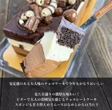 「スポンジも甘さ控えめでムースはなめらかな口当たり。どこから見ても美しい。クリスマスにぜひ買ってほしい1品です」とおすすめしているで、チョコレート好きな方はぜひチェックしてみるといいでしょう。