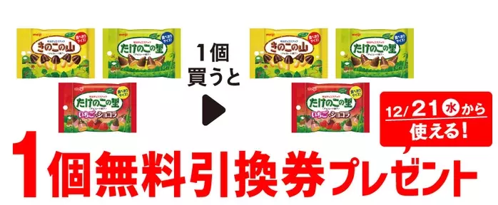12月20日(火)までに「きのこの山」「たけのこの里」「たけのこの里いちご&ショコラ」のポケットパックを購入すると、21日(水)~2023年1月3日(火)の間、もう一つ無料でもらえます。