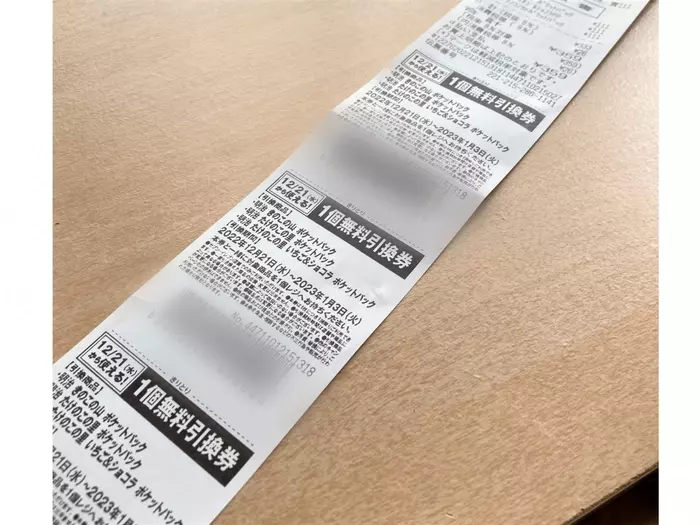 期間中に対象商品を買うと無料引換券がもらえるセブンイレブンの「プライチ」。無料引換券はレシートの下についてきます。ジュースやお茶、お菓子など、期間によって対象商品は変わりますが、今はこちら…12月20日(火)までに「きのこの山」「たけのこの里」「たけのこの里いちご&ショコラ」のポケットパックを購入すると、21日(水)~2023年1月3日(火)の間、もう一つ無料でもらえます。