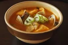 3、取り鉢に具とスープを少しずつ取り分け、<タレ>をからめていただく。途中でキムチを加えて味に変化をつけてもよい。