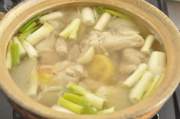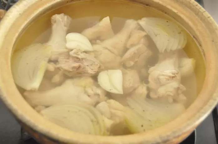 1、鍋に<スープ>の材料を入れ、鶏もも肉、鶏手羽元、玉ネギ、ニンニクを入れて強火にかける。煮たったらアクを取って弱火にし、鍋に蓋をして30分煮込む。