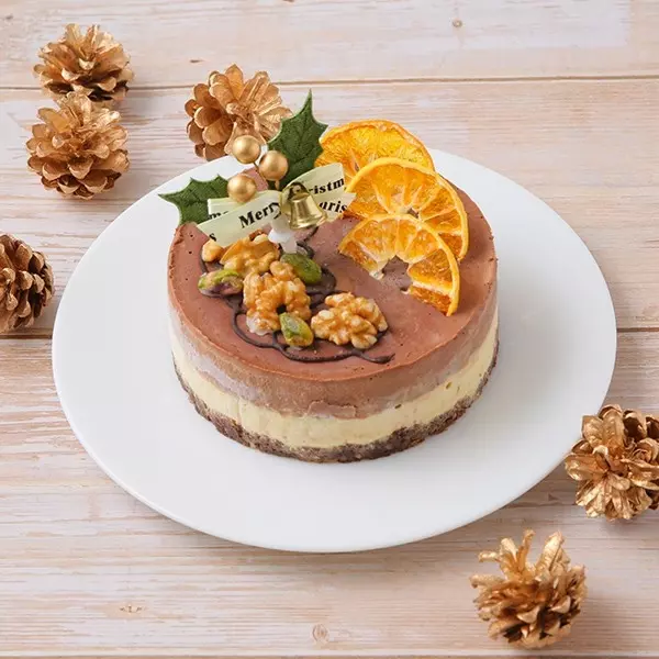 卵・乳製品・小麦・不使用。動物性食品であるゼラチンも使用せず、カシューナッツで作った植物性ミルクとカカオバターで作った濃厚で滑らかなムースのようなケーキです。オレンジ味の生地とチョコレート味の生地が二層に重なっています。