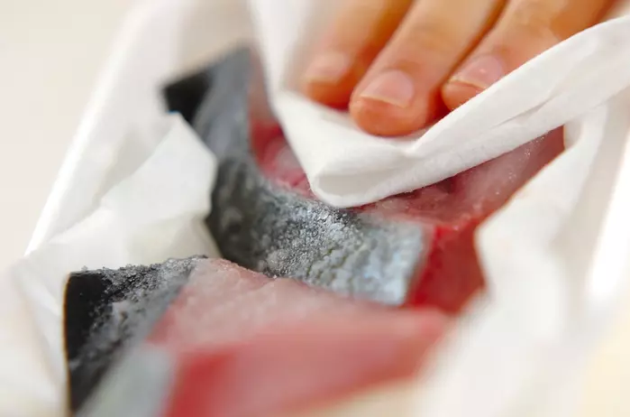 焼き物や揚げ物のときは、切り身に塩をふりしばらく置き、出てきたドリップをキッチンペーパーなどでしっかり拭き取ります。煮物などの場合は、塩をふりドリップを拭いたあと、熱湯を回しかけ霜降りにすると臭みがなく仕上がります。調理法によって使い分けて下さいね。