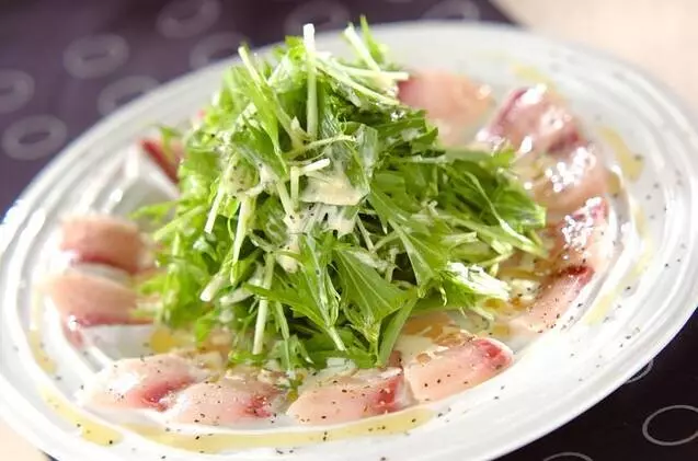 刺身用のブリを冷やしたお皿に並べて、マヨネーズ入りのカルパッチョソースをかければ和洋折衷なカルパッチョが完成します。お好みで粉チーズをかけると味に奥行きが出ます。