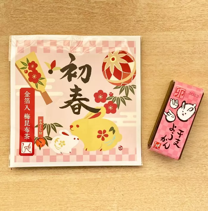 2023年の干支「うさぎ」のイラストが描かれた一口ようかん。北海道産小豆を使用した黒糖の濃厚な味わいが特徴です。お茶と一緒に食べたいですね。
