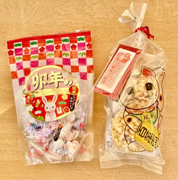干支のうさぎや、富士山などのめでたいイラストが描かれた小袋(約25個)が入っていて、それぞれにチョコレートボールが2つ入っています。